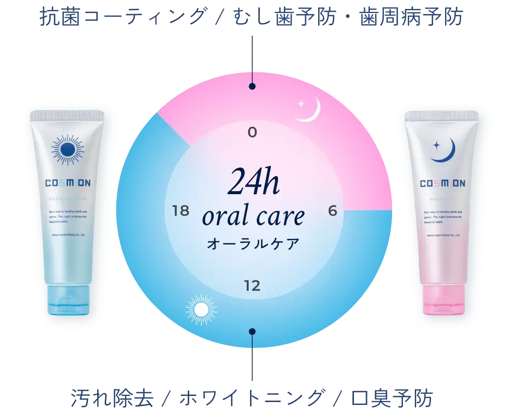 一日の中で大きく変わる口内環境、菌が増える夜・汚れが増える朝に本当は何が必要なのか、歯磨き粉も適材適所、それぞれの環境にあった2本を使い分けることで、口内環境はもっと清潔に美しく保つことができます。